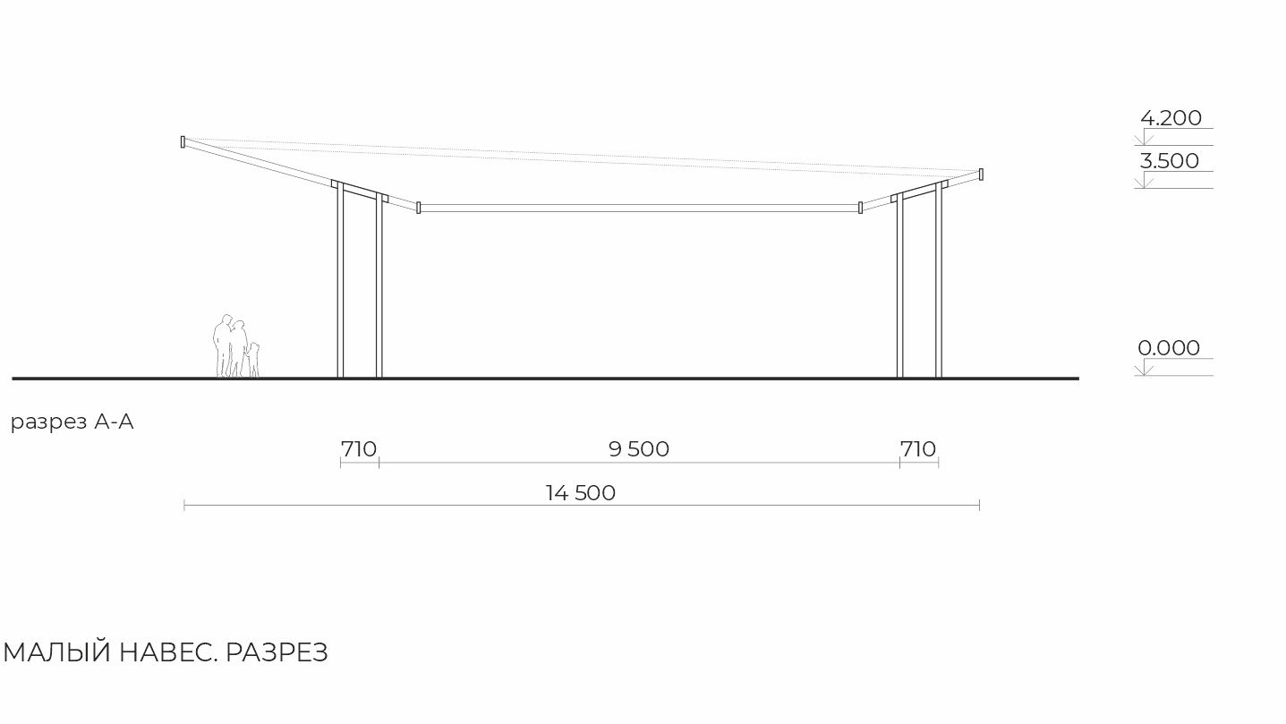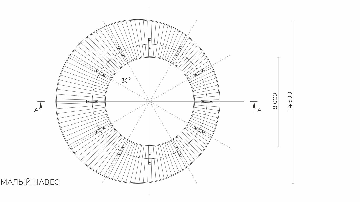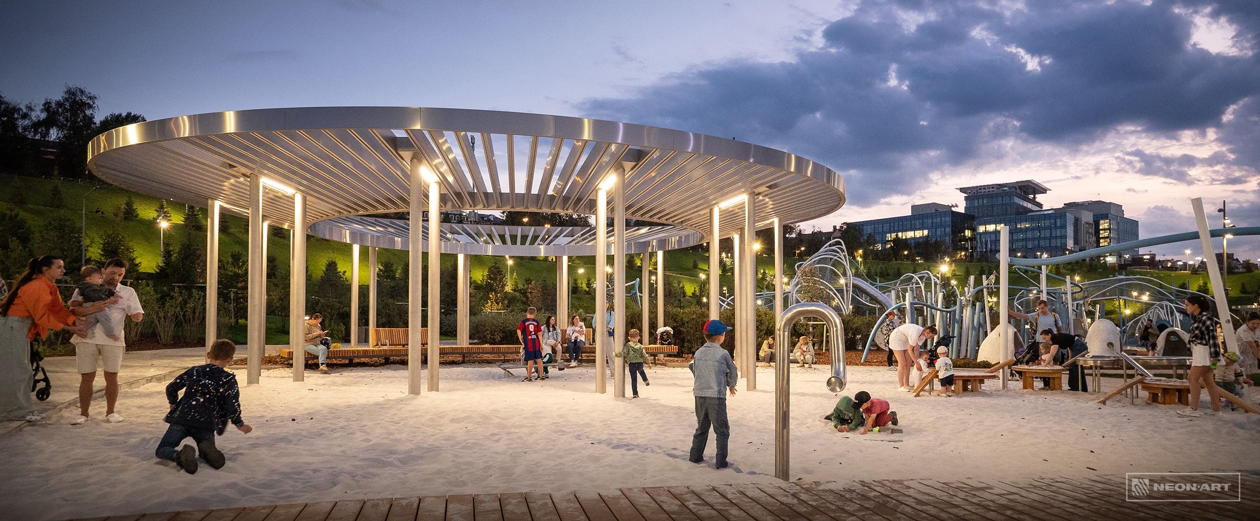 Два теневых навеса в игровой зоне изготовлены аналогично центральному, но меньшего размера— 14.5 метра в диаметре.