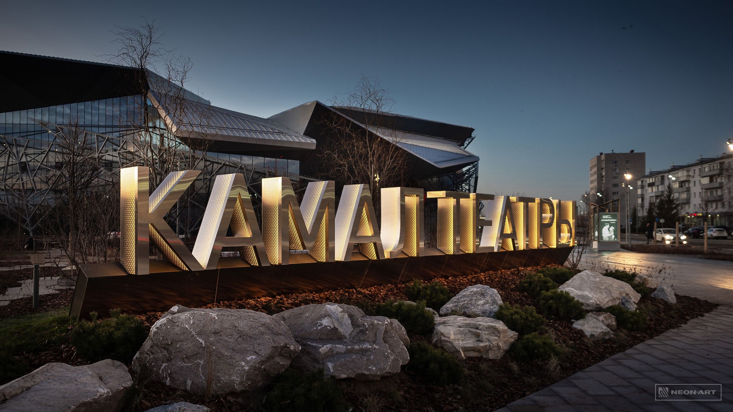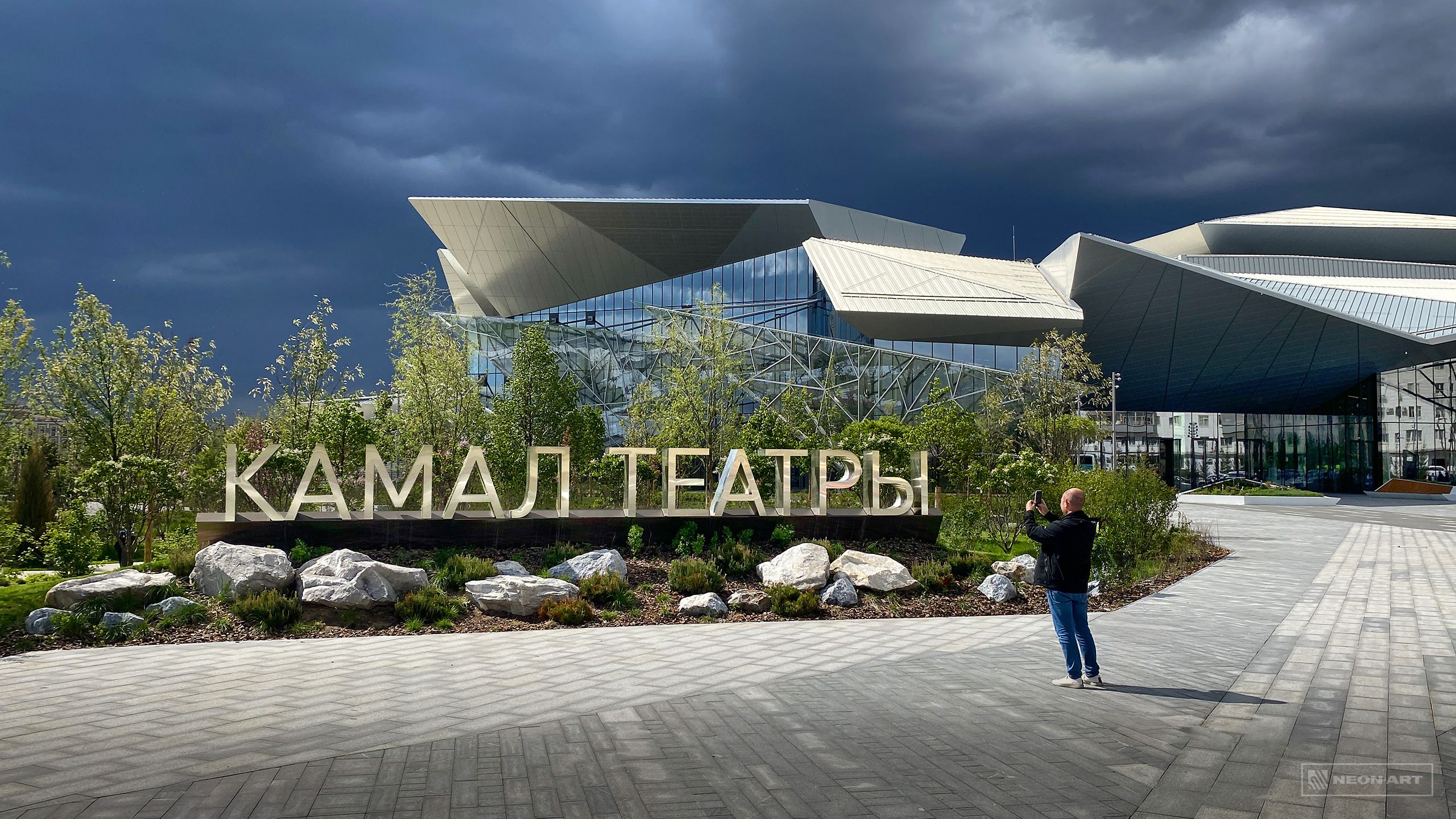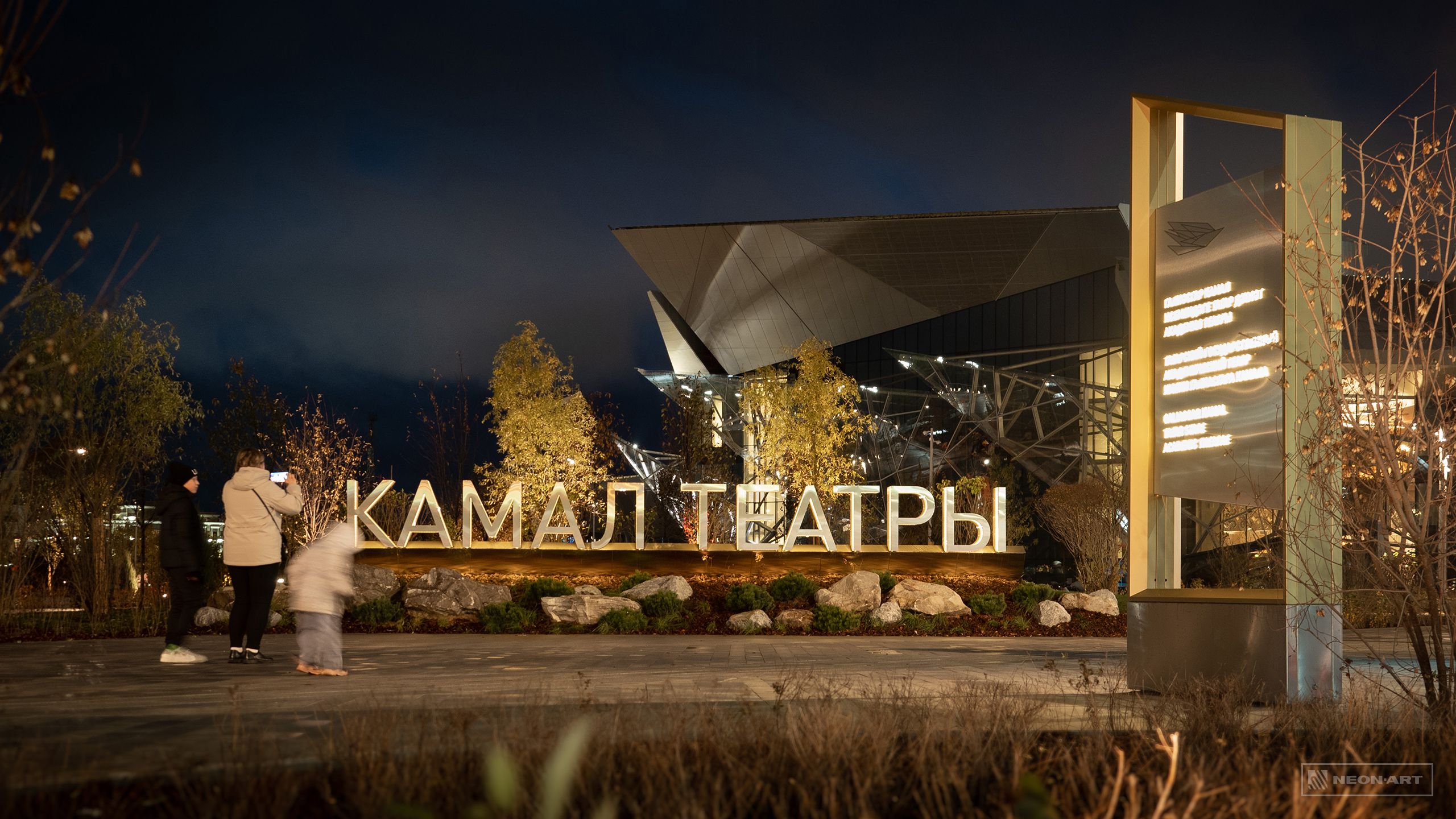 Для того чтобы не нарушать сложную пластику фасада нового театра, решено вывеску сделать в виде отдельно стоящего арт-объекта, вокруг которого формируется площадь. Размеры букв продиктованы масштабом театра и читаемостью с основного направления восприятия.