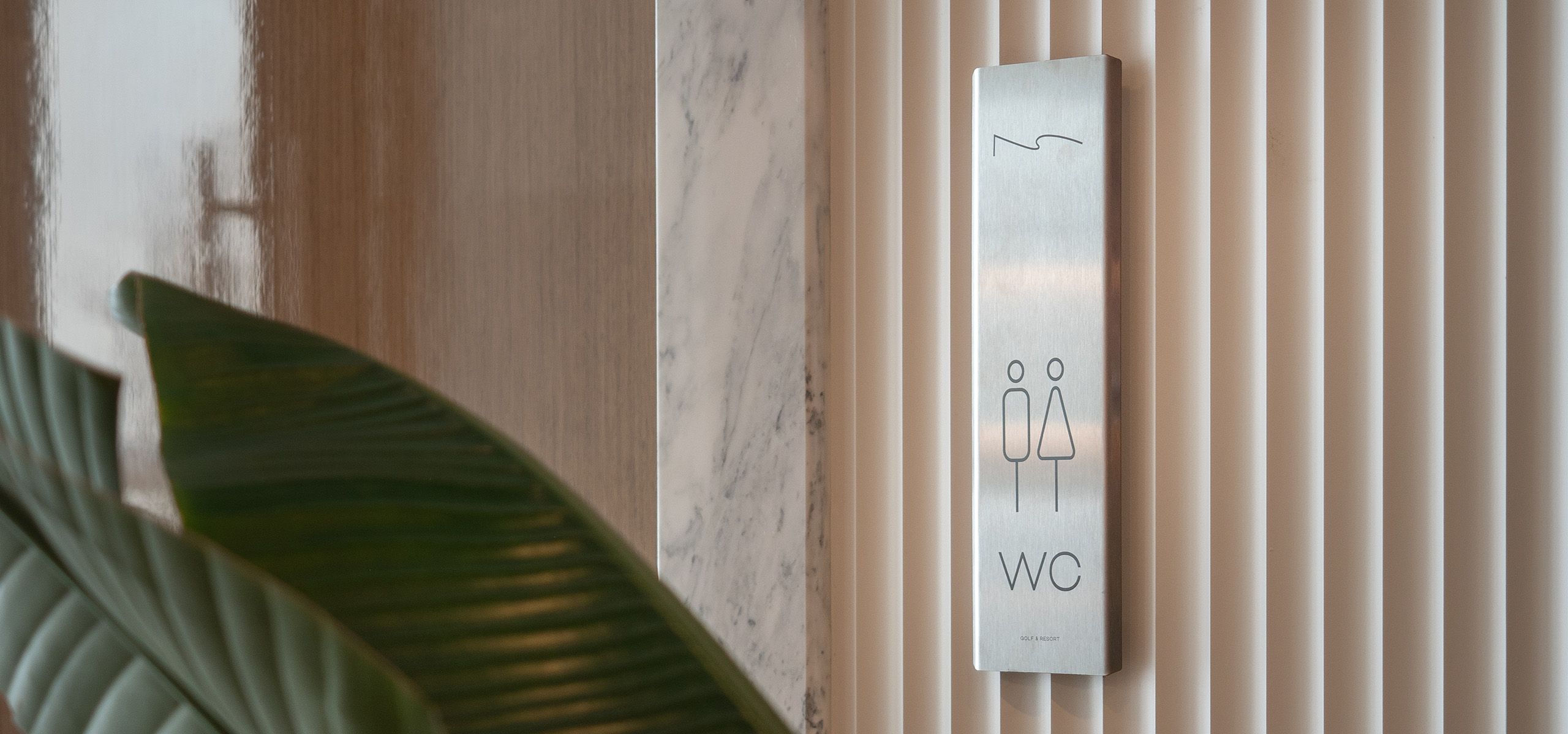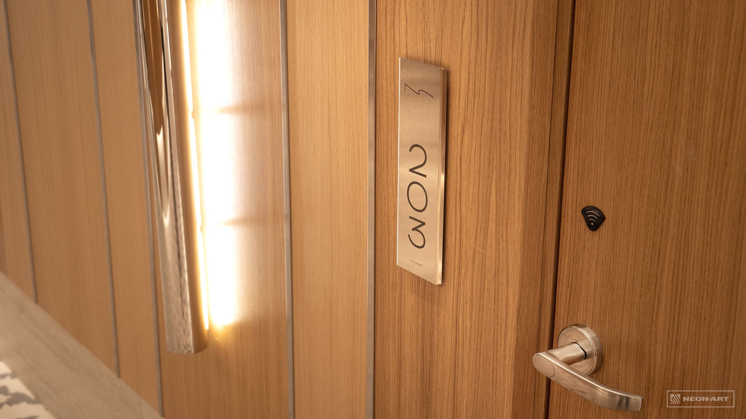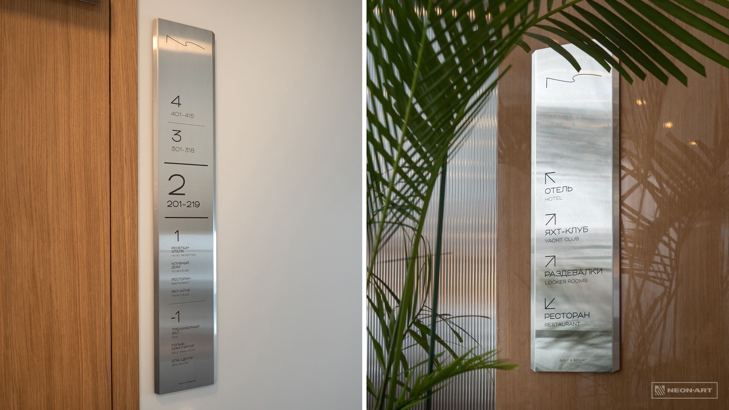 Изготовлены таблички с вертикальным направлением для внутренней навигации отеля. Применение нержавеющей стали и нанесение гравировки позволило добиться эффекта игры солнечных бликов и отражений на поверхности металла.