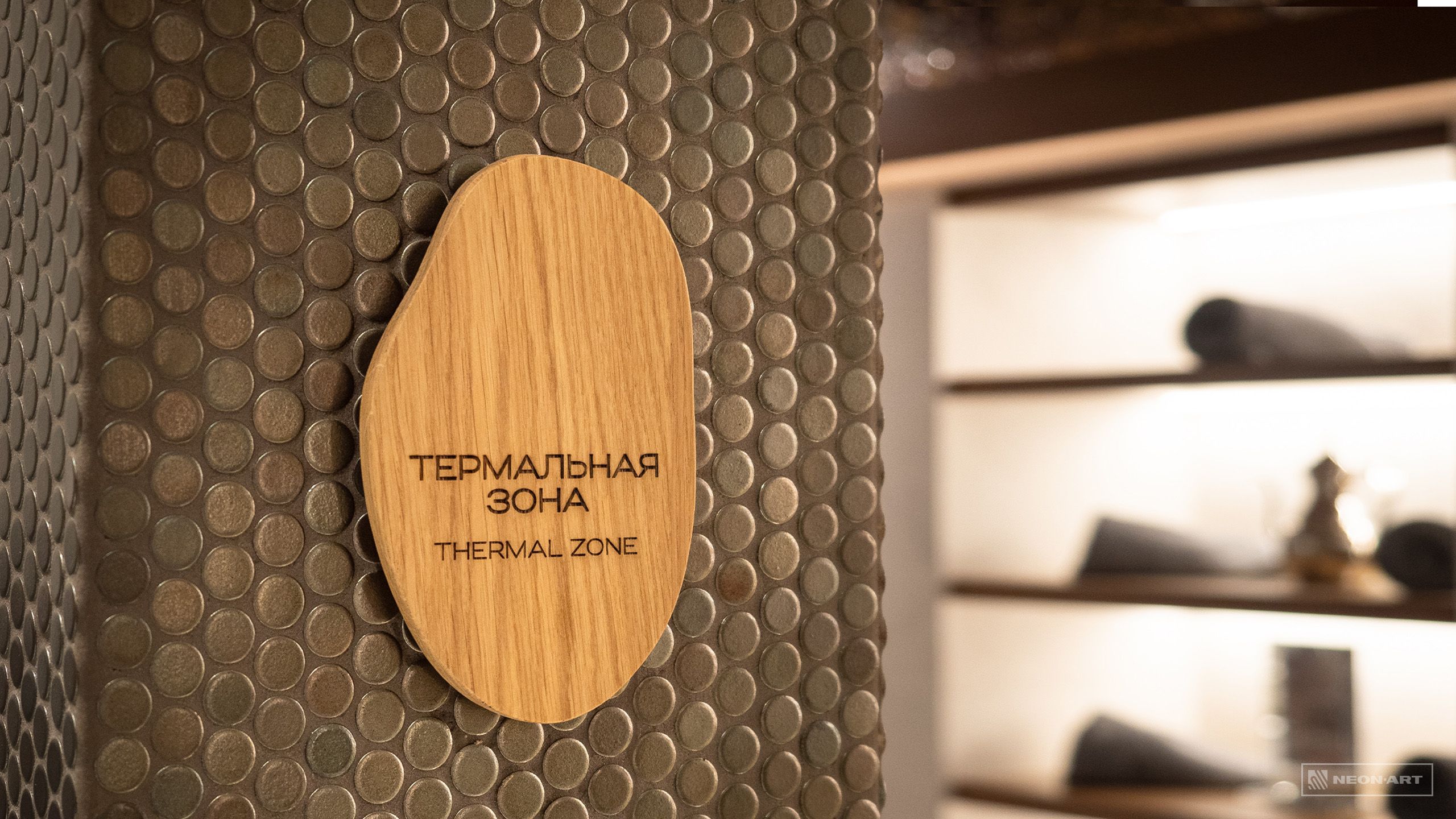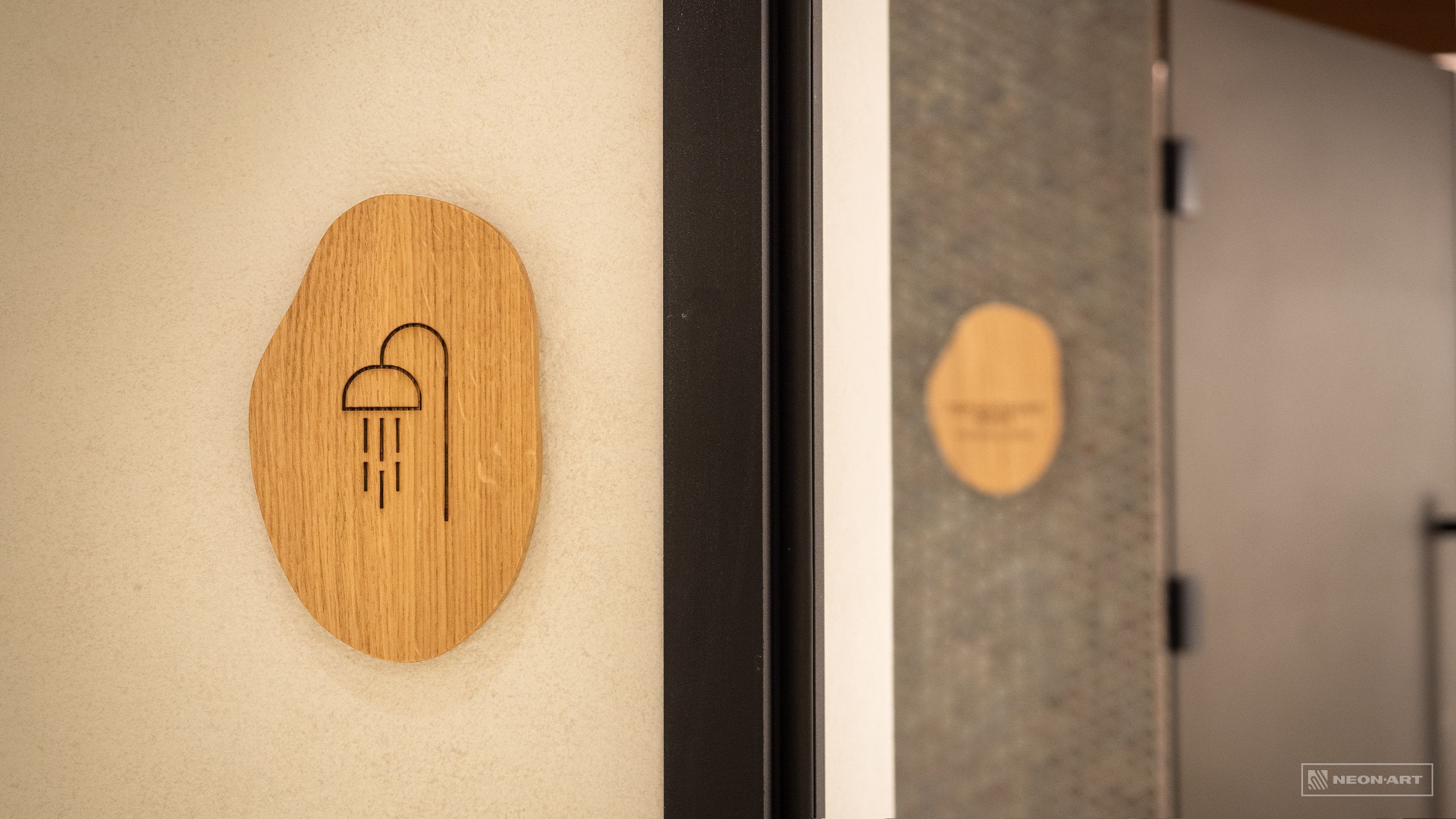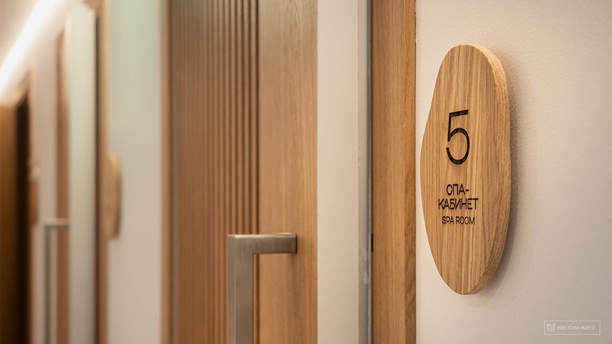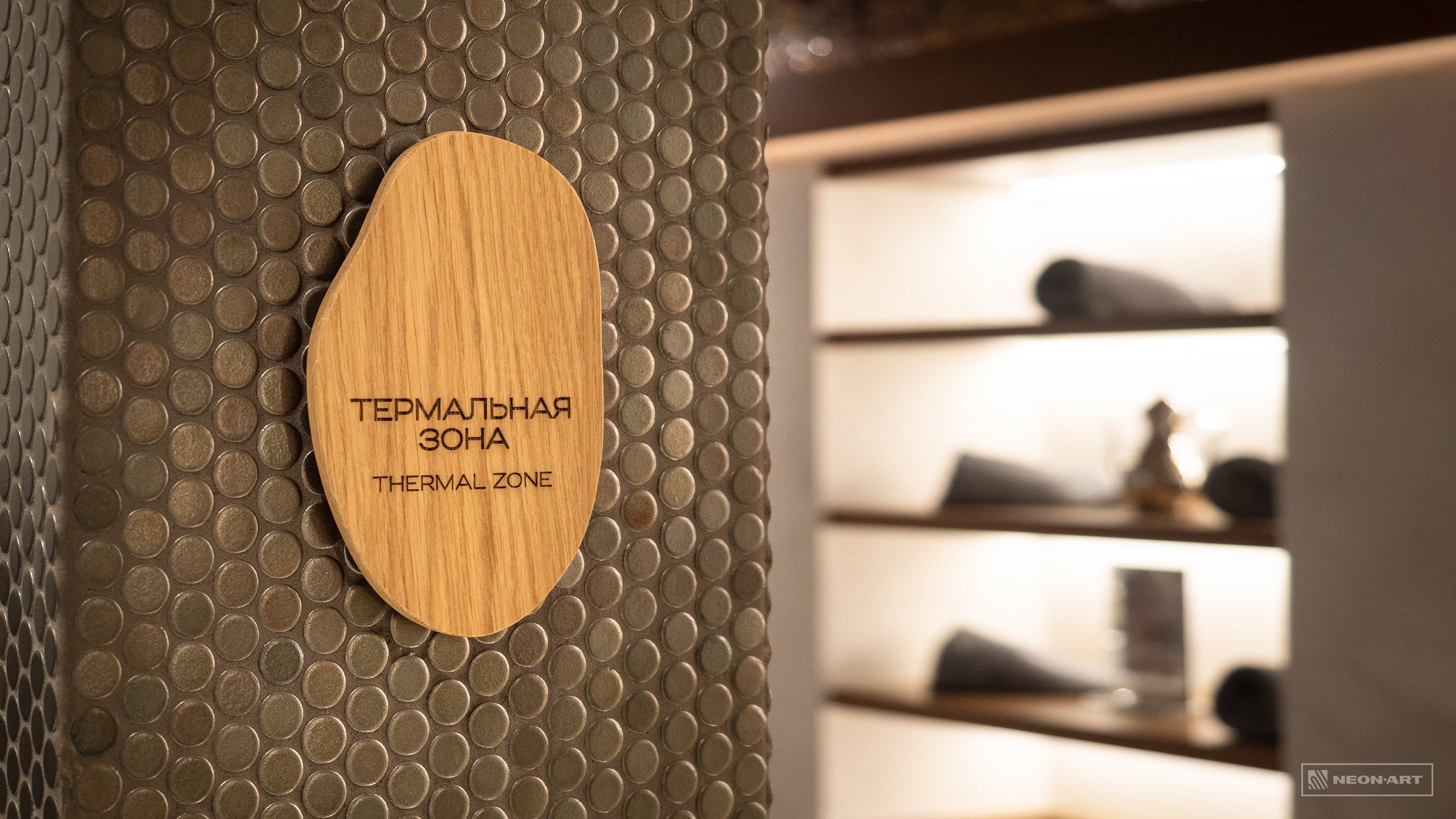 Таблички для спа-зоны выполнены из дерева с углублением инфомации с помощью лазер-гравюра.