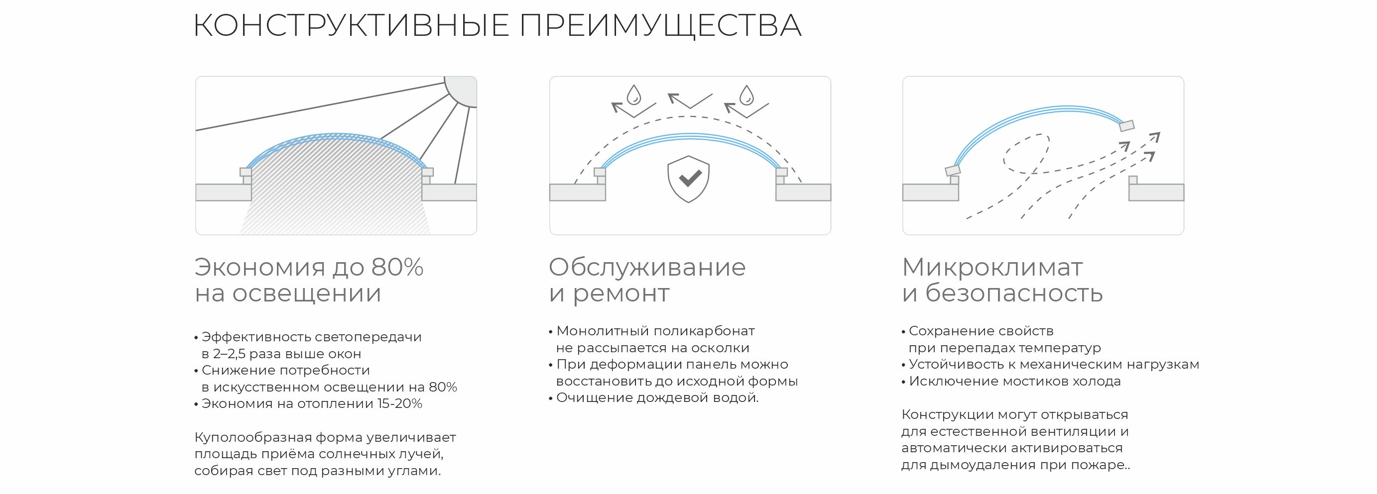 Продукт обеспечивает эффективное естественное освещение производственных цехов, складов, торговых залов, а также жилых помещений, сокращая расходы на электроэнергию и формируя комфортный микроклимат.