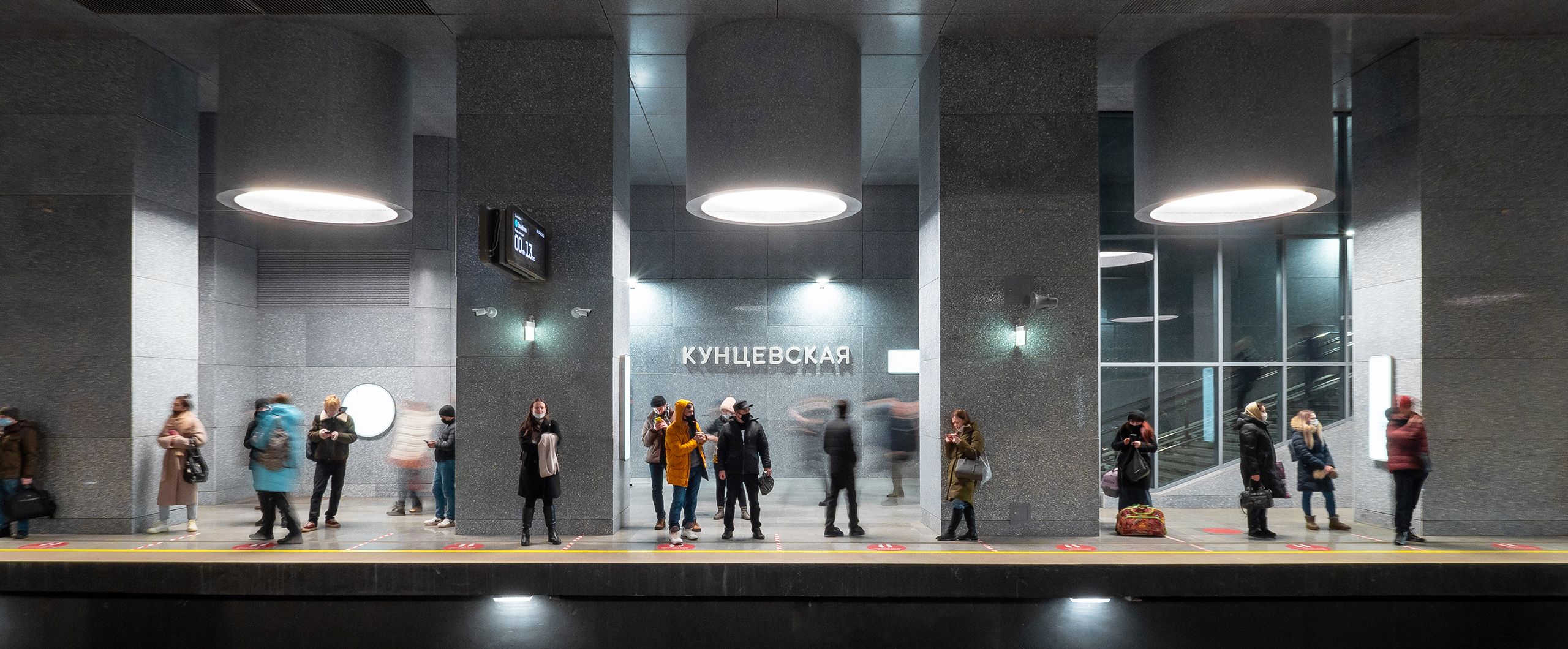 «Кунцевская» — торшеры цилиндрической формы создают стройный ряд световых труб.