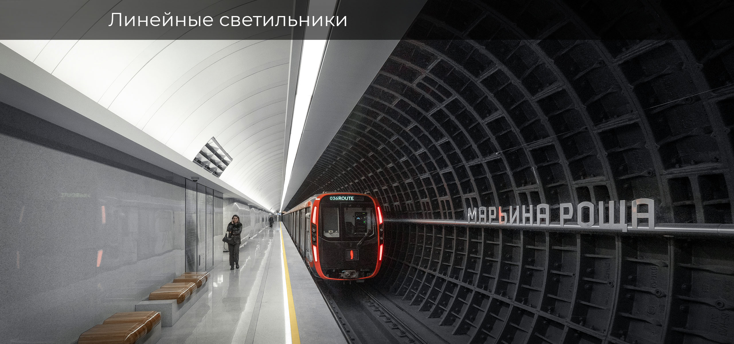 «Марьина Роща» — модульный профиль образует тонкую световую нить вдоль перрона, равномерно освещая пространство.