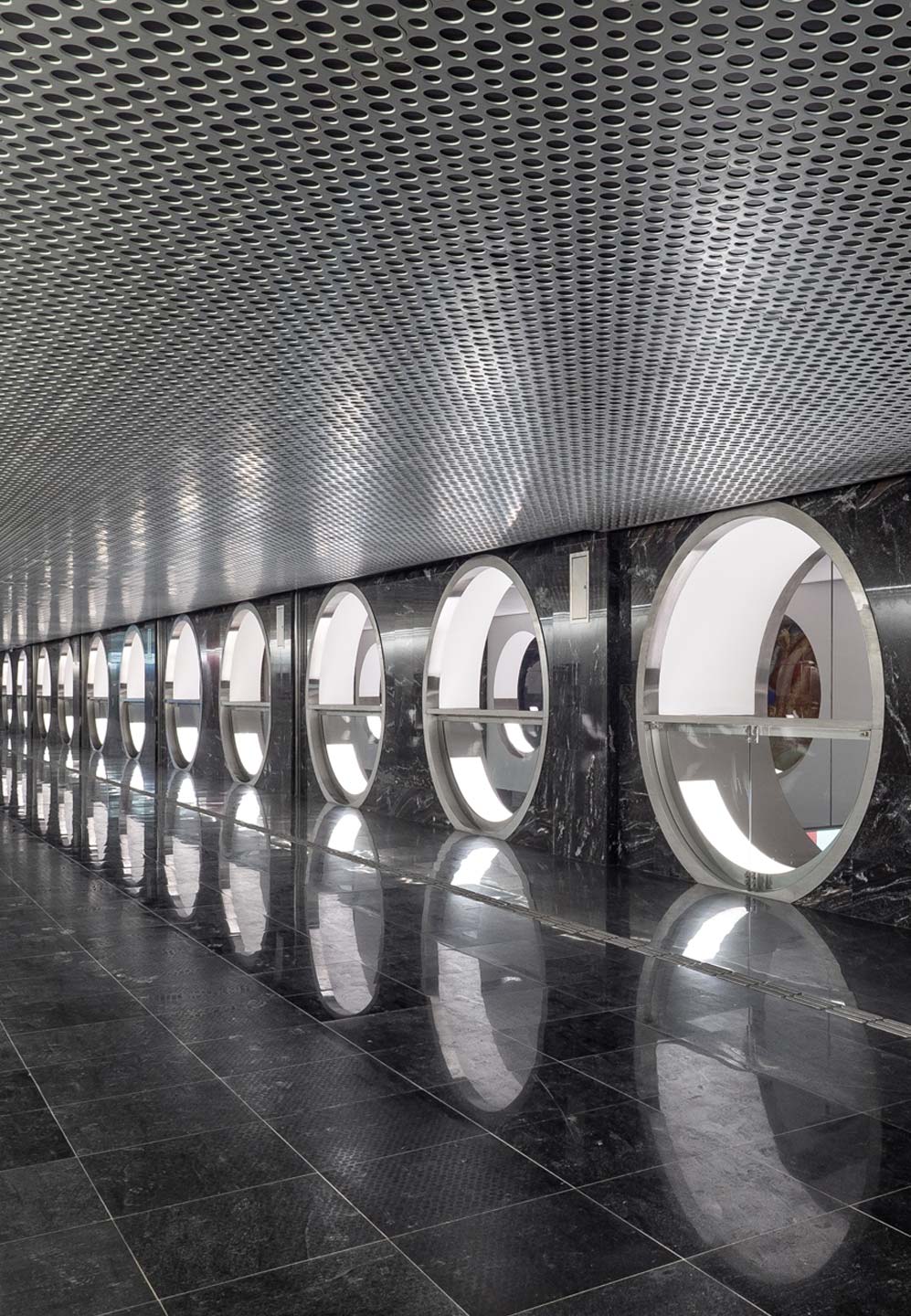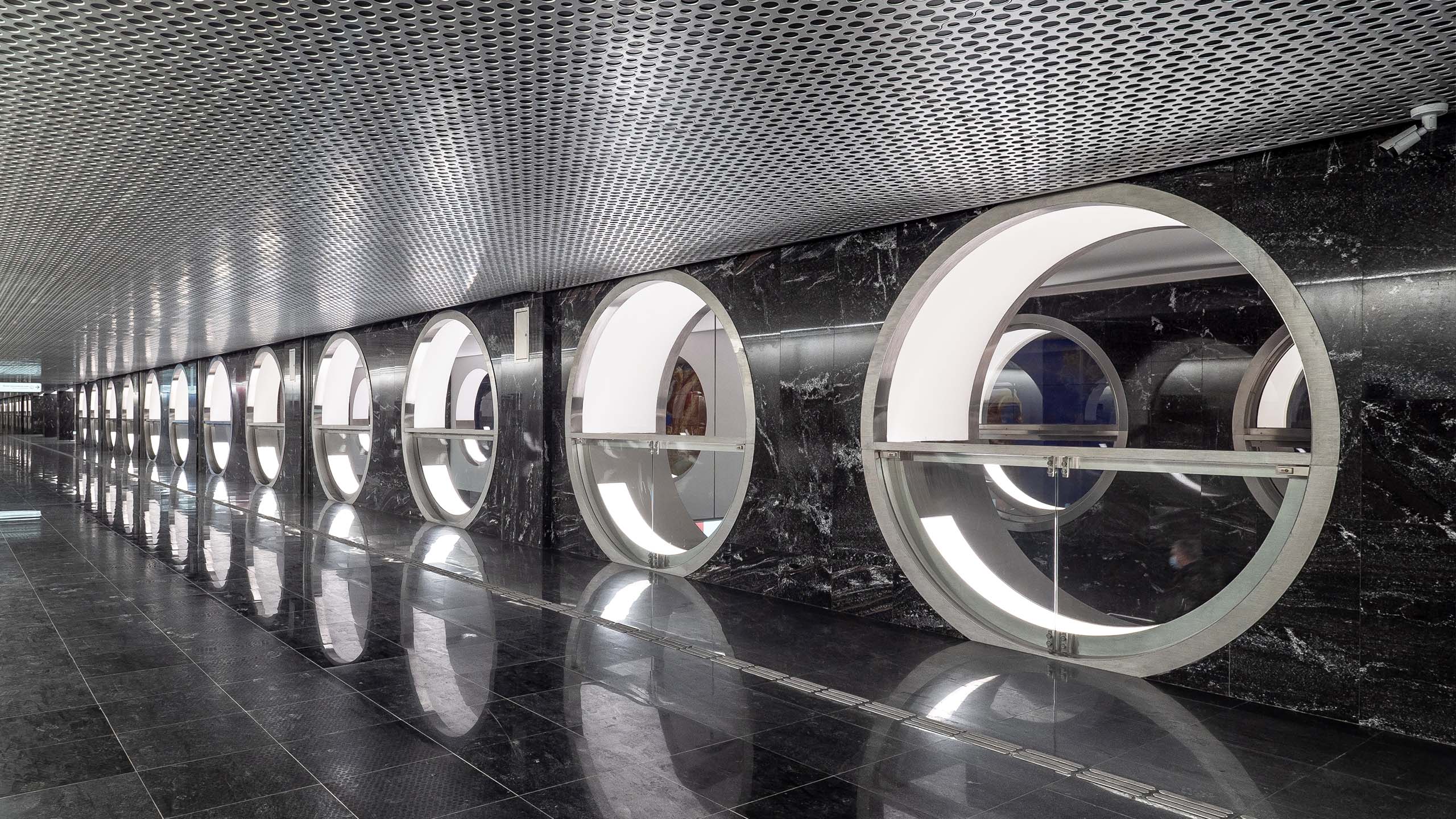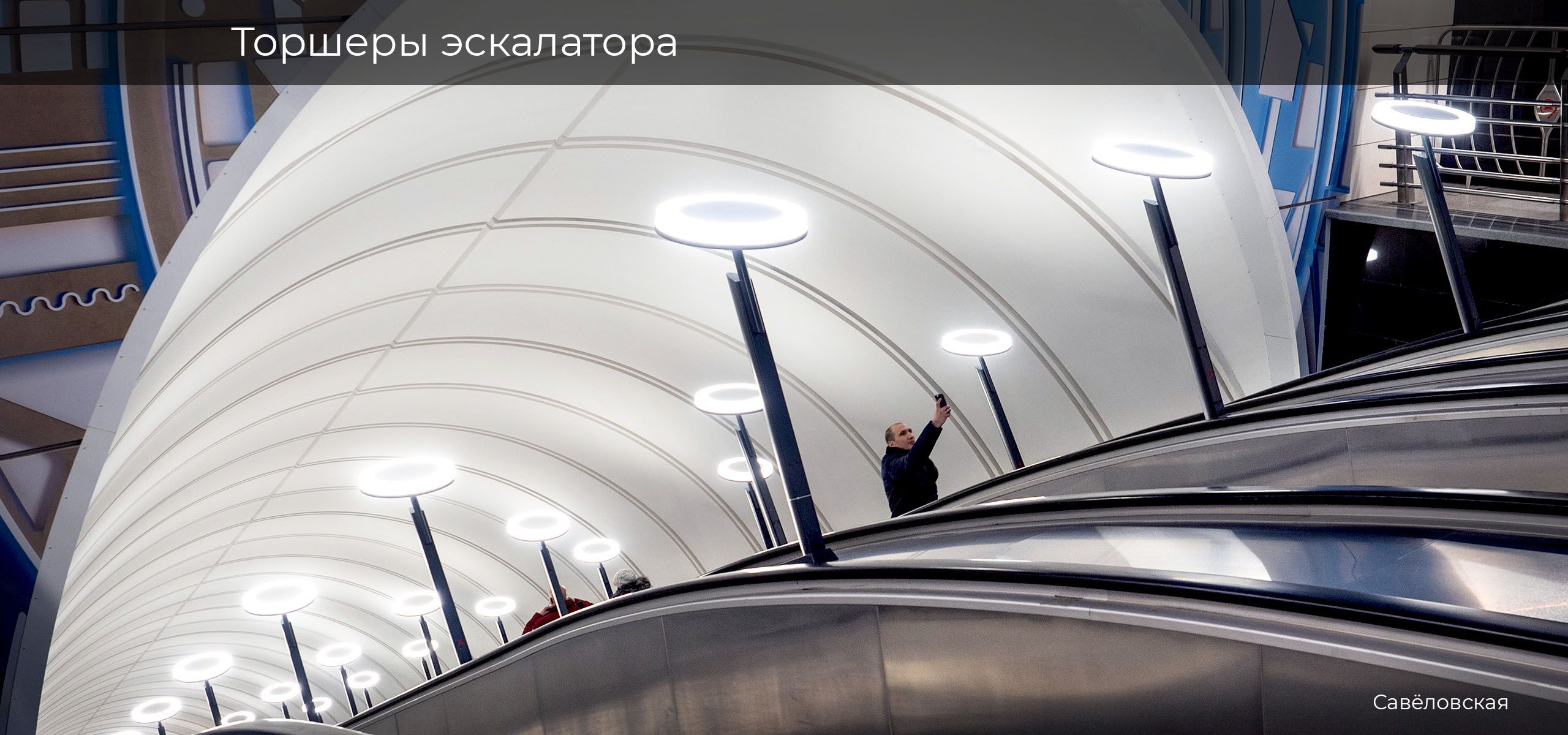 «Савёловская» — круглая форма плафона органично вписывается в полуциркулярный свод тоннеля, тёмные стойки задают контрастный визуальный ритм.