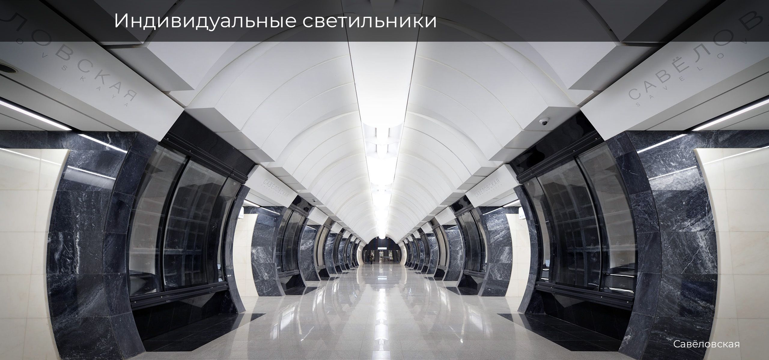 «Савёловская» — платформу освещает линия формованных светильников, встраиваемых в белый потолочный свод станции. Световой элемент является композиционной доминантой платформы и объединяет собой пространство.