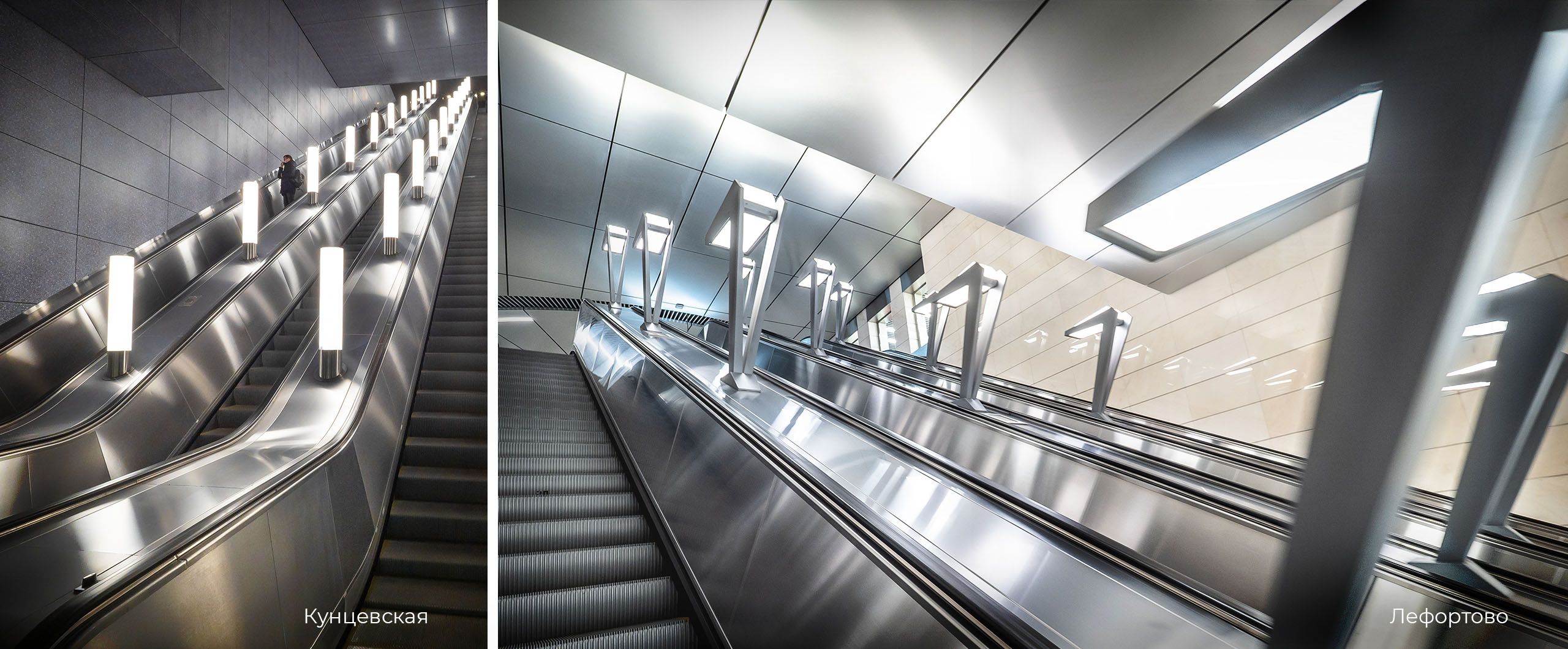 Торшеры эскалатора не нарушают стилистические концепции станций метрополитена: